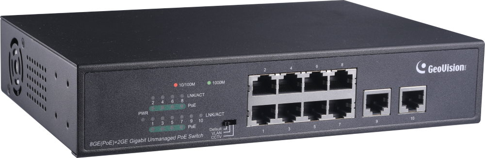 GV-APOE0810 is a 10-port 10/100/1000 Mbps unmanaged PoE Switch with 8 PSE/PoE ports and 2 uplink ports. The switch supports IEEE 802.3at Power over Ethernet standard, up to 32 W per port, for up to 8 GV-IP devices and a maximum power consumption of 125 W. In addition to not requiring special network cables for connecting your powered devices (PD), such as IP cameras, it also allows power supply over cables of up to 250 m (820 ft) in length, at 10 Mbps. The switch is designed for small or medium network environment to strengthen its network connection and efficiency. It also gives you the option of VLAN mode to isolate each of the PoE ports for an enhanced forwarding rate of time.