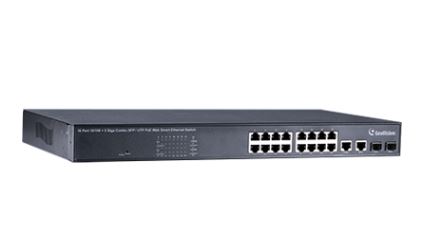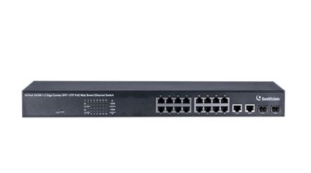 GV-POE1601-V2 is a 16-port 10/100BaseTX with RJ-45 Connectors, PoE+ plus 2-port Gigabit Copper/SFP Combo Uplink Port Rack-mount Web Smart PoE Switch. The switch supports IEEE 802.3at Power over Ethernet standard, with up to 30 W per port and a maximum power consumption of 250 W. It eliminates the need for power cables to connect your powered devices (PD), such as IP cameras. The switch provides exceptionally smart Web management features, such as VLAN, QoS, RSTP, IGMP Snooping, Port Security, and more.